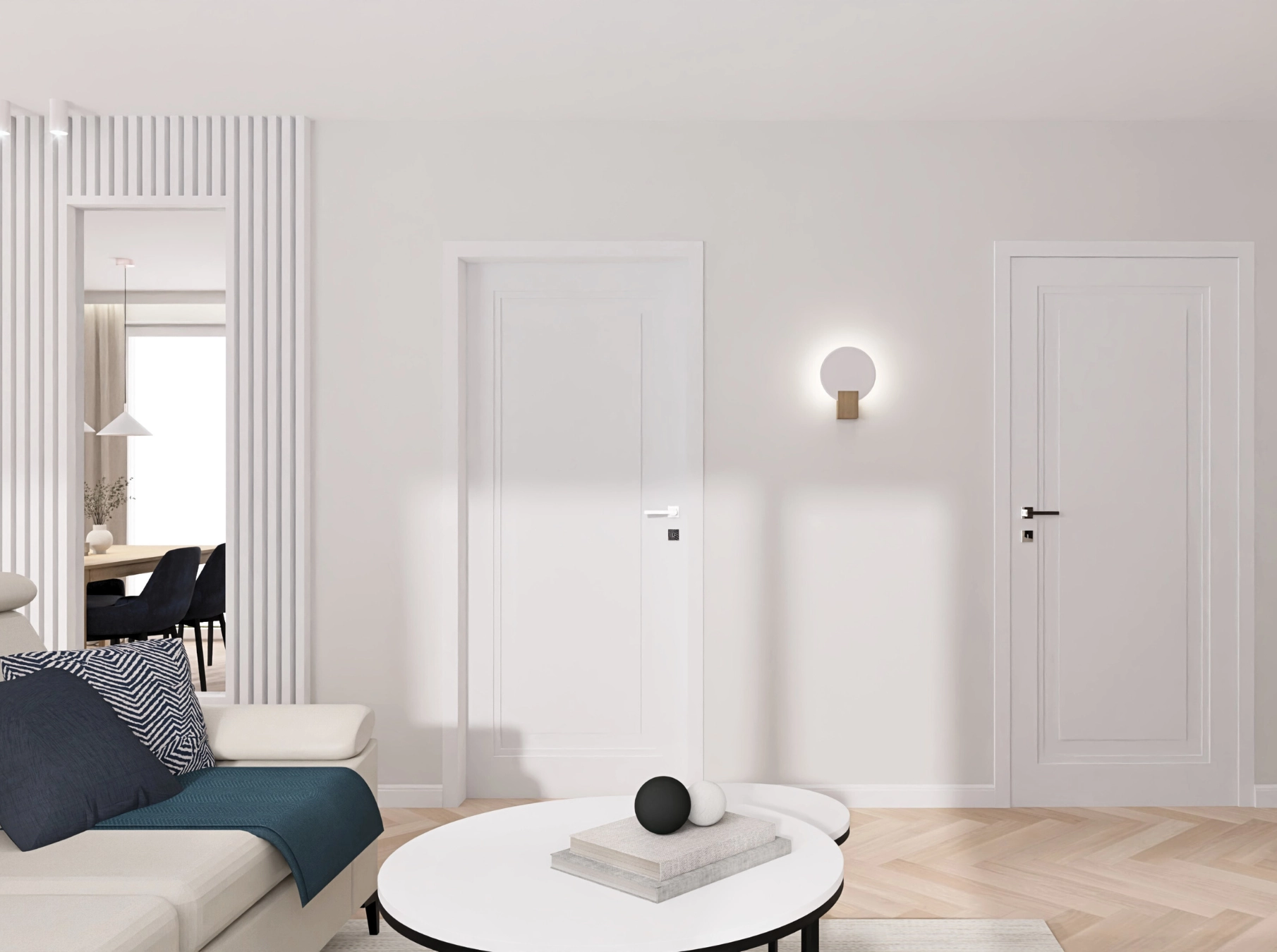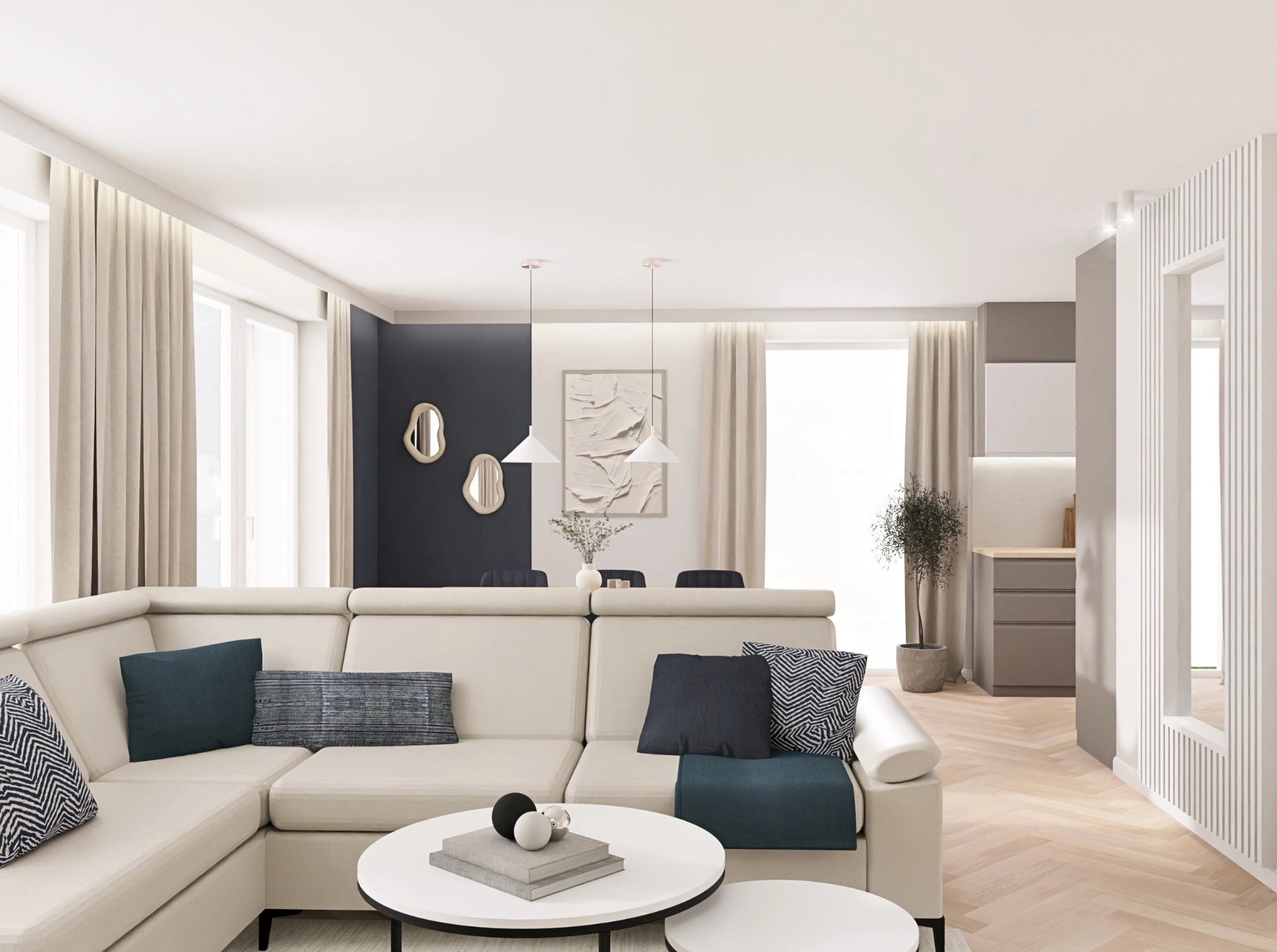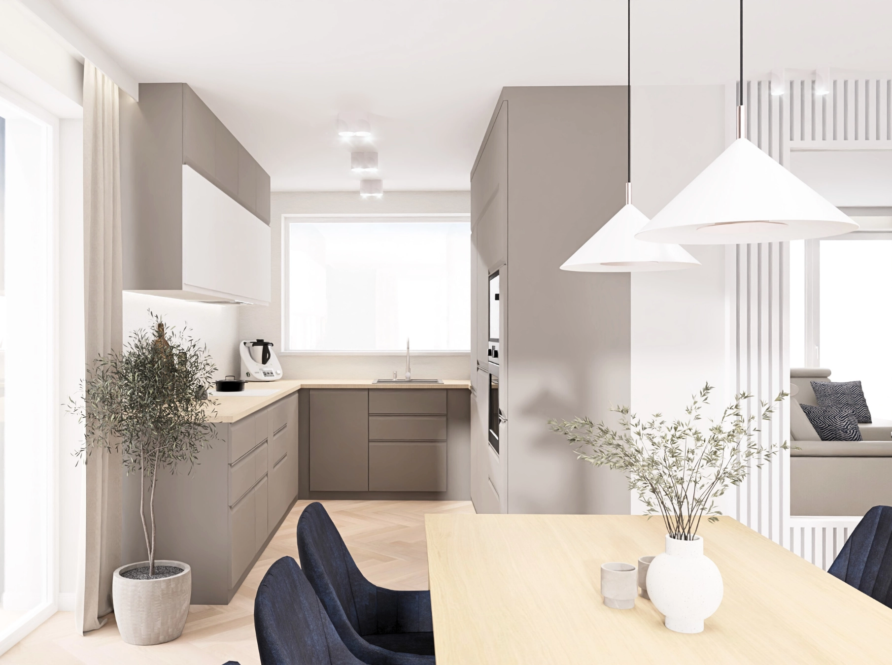 Projekt dla Pani Kamili i jej rodziny to wnętrze oparte na jasnej, przytulnej bazie z wyrazistym akcentem granatu. Kuchnia została zaplanowana w systemie IKEA, co jest dowodem na to, że meble z sieciówki również mogą stworzyć przestrzeń skrojoną na miarę. W projekcie uwzględniłam szeroki blat roboczy, wysoką zabudowę na sprzęty oraz sprytne, „niewidoczne” przejście do spiżarni. Biel, taupe i blat w ciepłym odcieniu drewna tworzą ponadczasową kompozycję, która nigdy się nie znudzi. Uważam, że jest to bardzo istotne w przypadku inwestycji w zabudowę kuchenną.