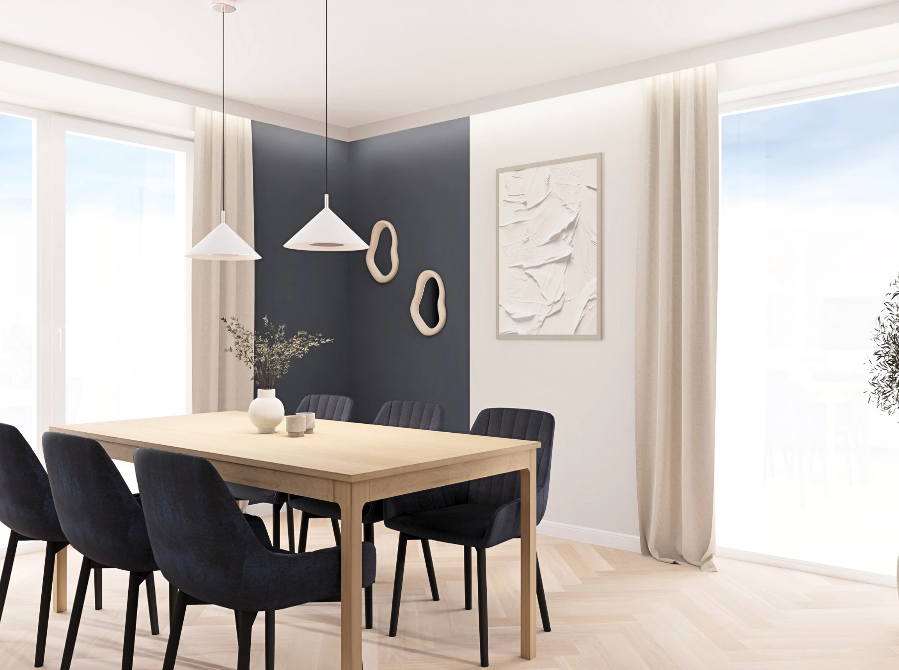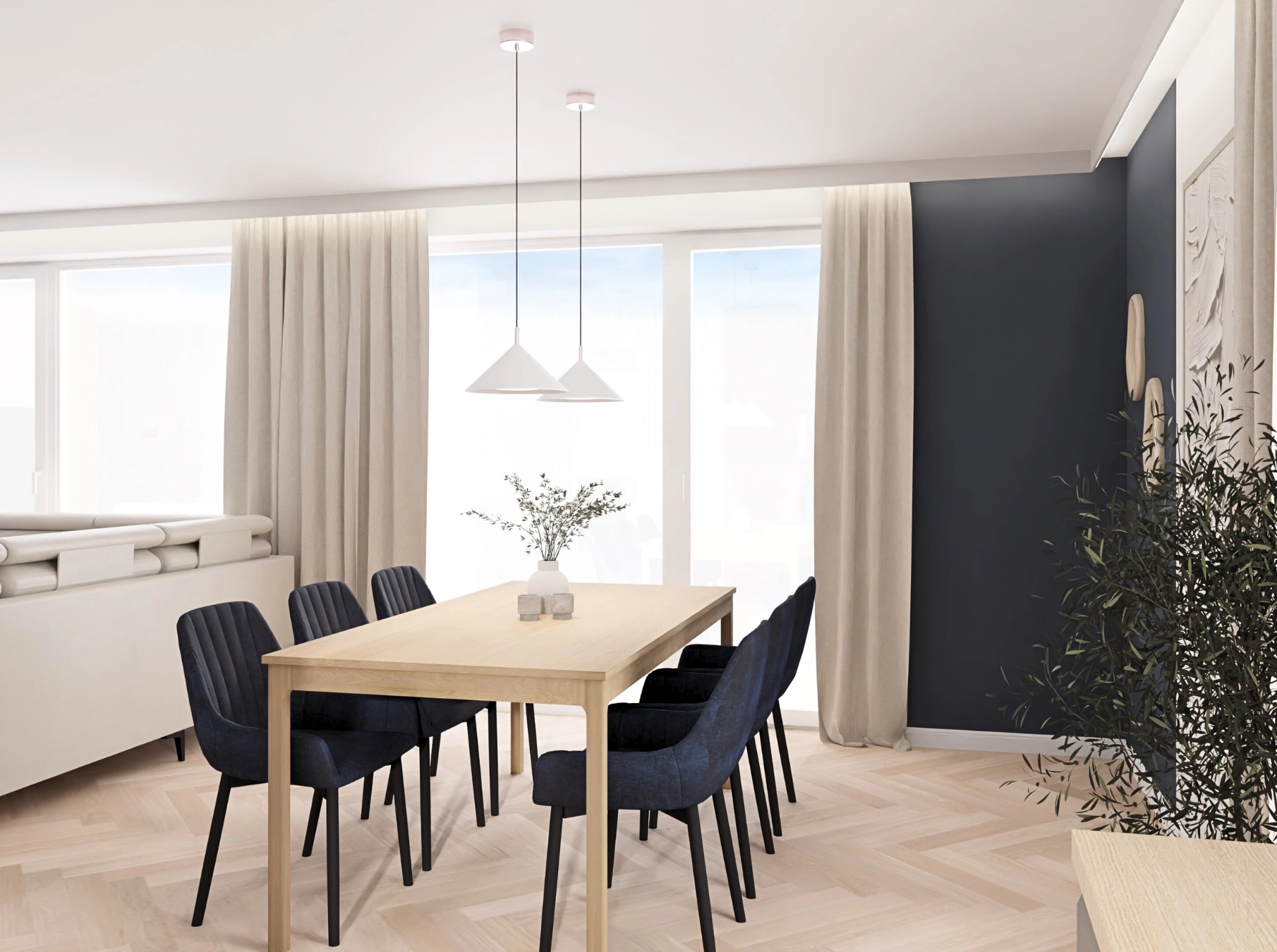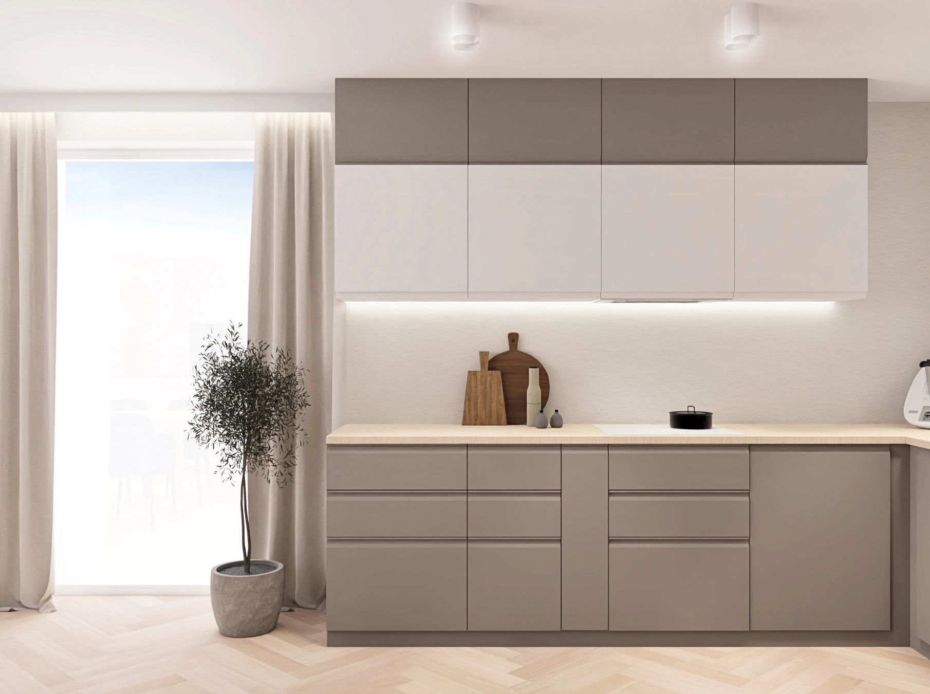 Projekt dla Pani Kamili i jej rodziny to wnętrze oparte na jasnej, przytulnej bazie z wyrazistym akcentem granatu. Kuchnia została zaplanowana w systemie IKEA, co jest dowodem na to, że meble z sieciówki również mogą stworzyć przestrzeń skrojoną na miarę. W projekcie uwzględniłam szeroki blat roboczy, wysoką zabudowę na sprzęty oraz sprytne, „niewidoczne” przejście do spiżarni. Biel, taupe i blat w ciepłym odcieniu drewna tworzą ponadczasową kompozycję, która nigdy się nie znudzi. Uważam, że jest to bardzo istotne w przypadku inwestycji w zabudowę kuchenną.