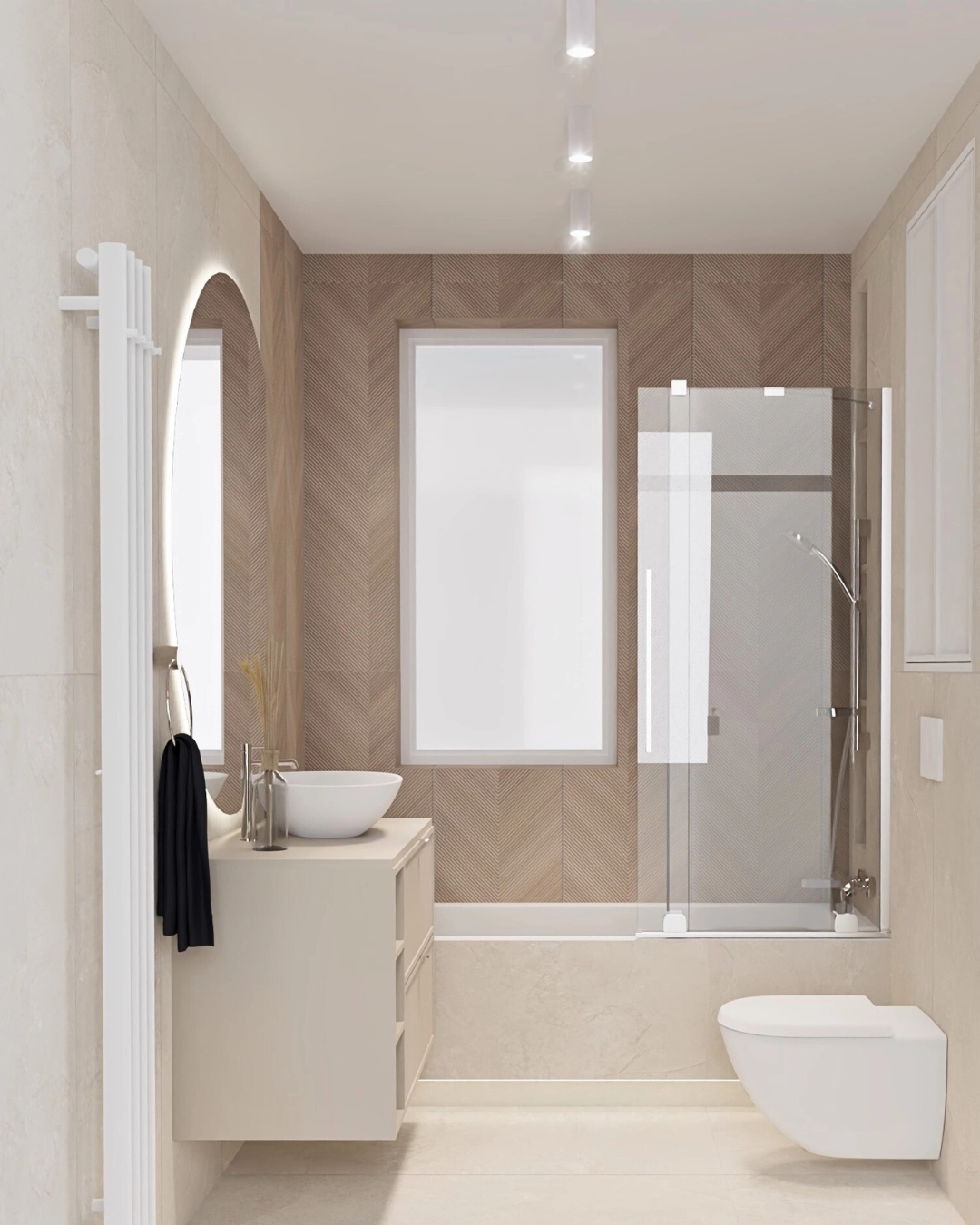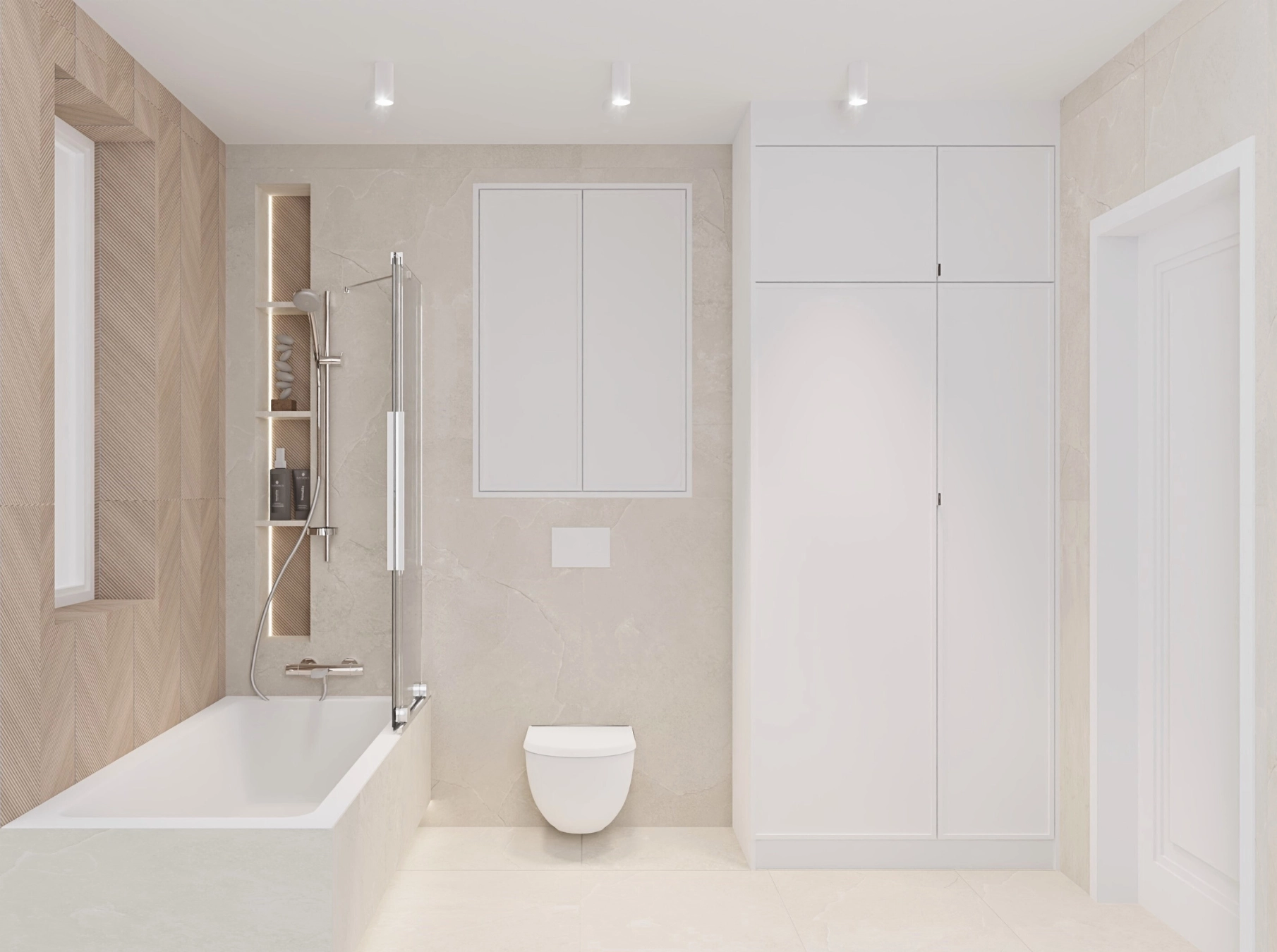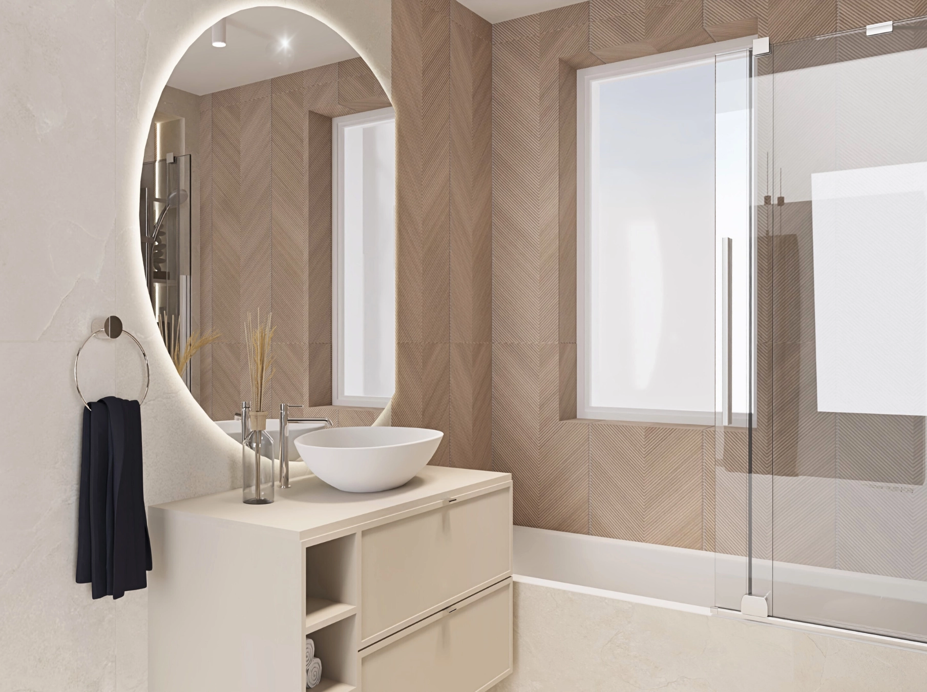 Łazienka to połączenie funkcjonalności i subtelnej elegancji. Delikatny wzór jodełki, prosta forma i naturalna paleta tworzą spokojne, łatwe w utrzymaniu czystości wnętrze. Wygodna wanna z parawanem oraz klasyczna słuchawka prysznicowa (bez deszczownicy) odpowiadają dokładnie na potrzeby inwestorów.