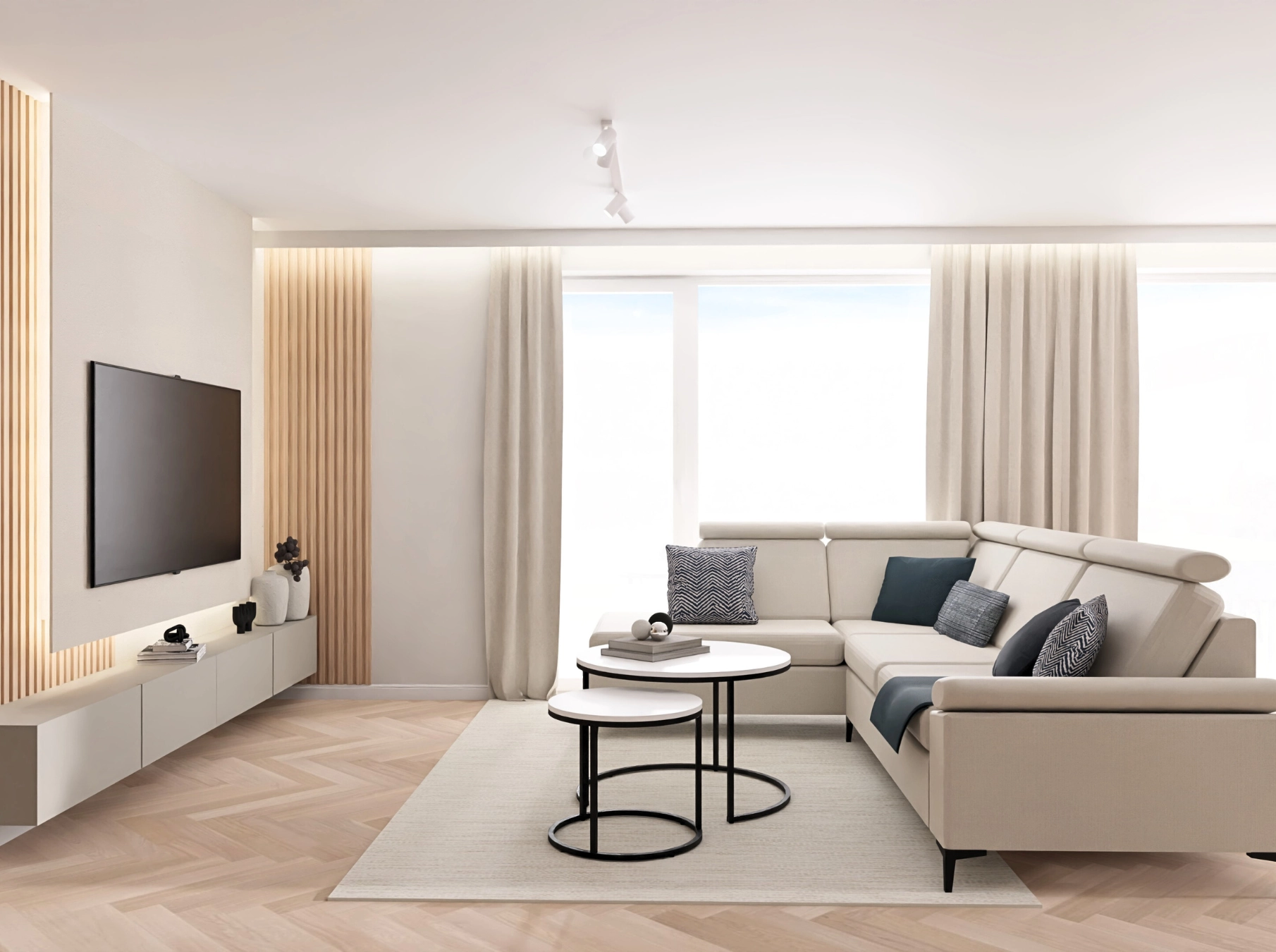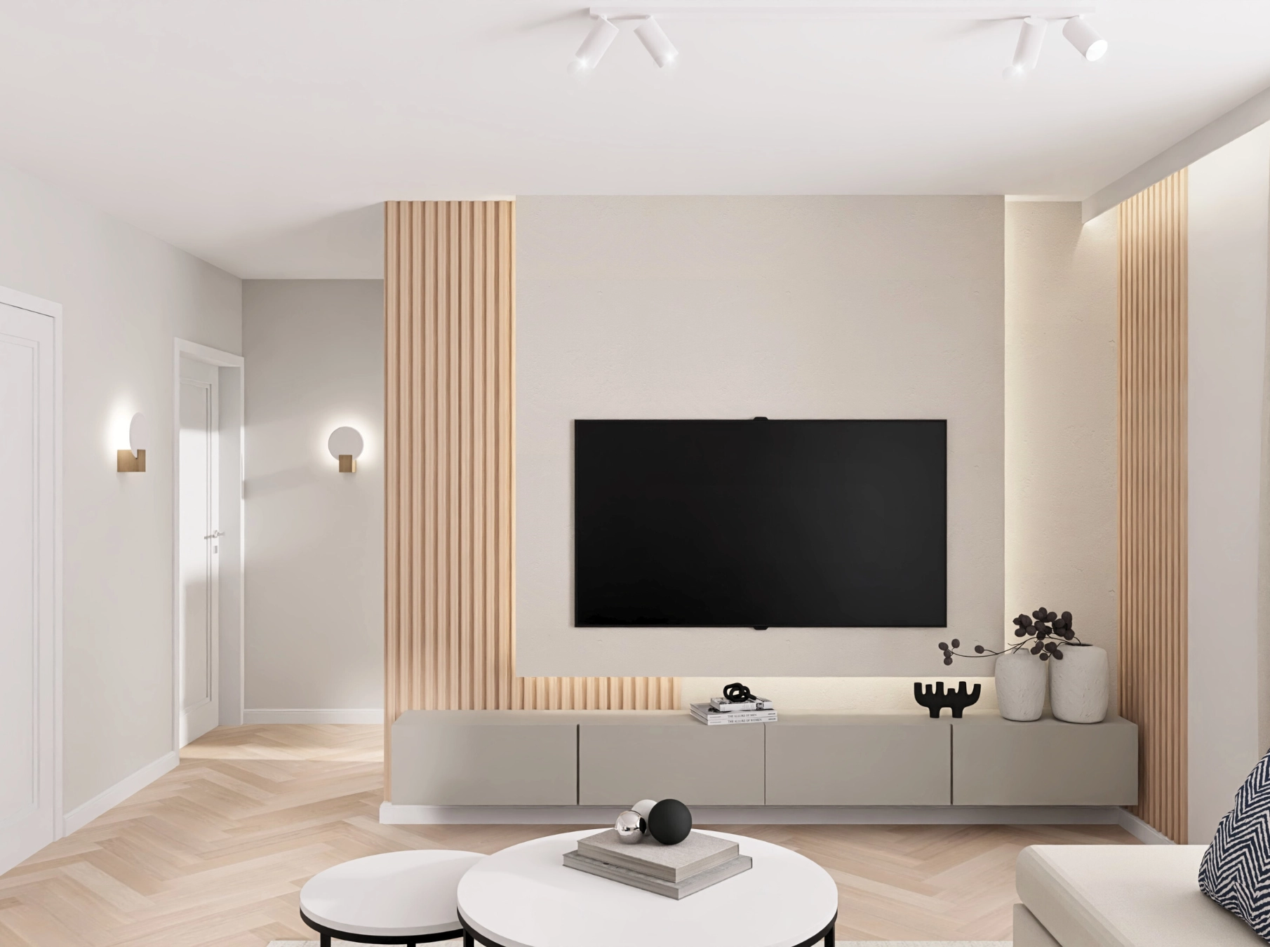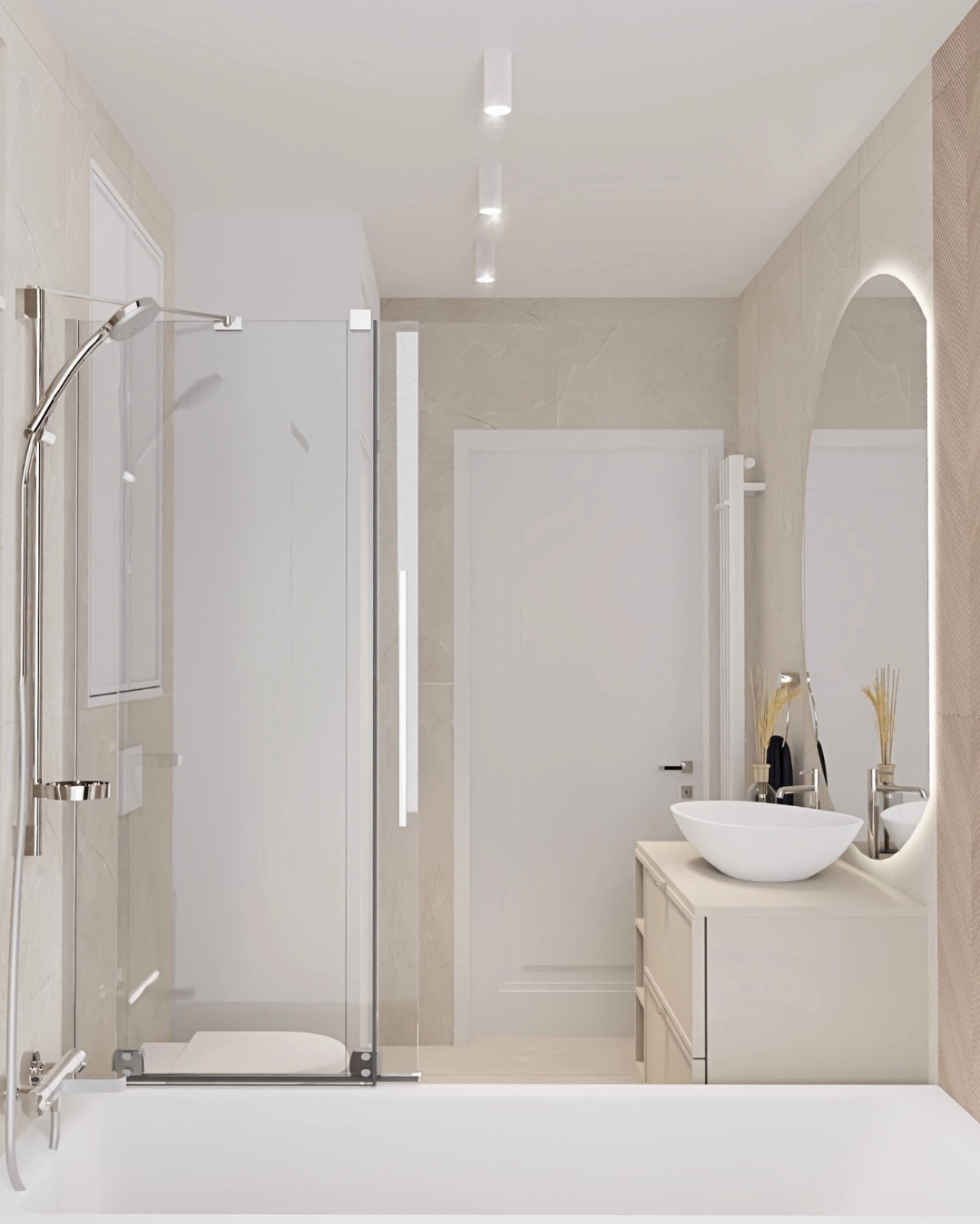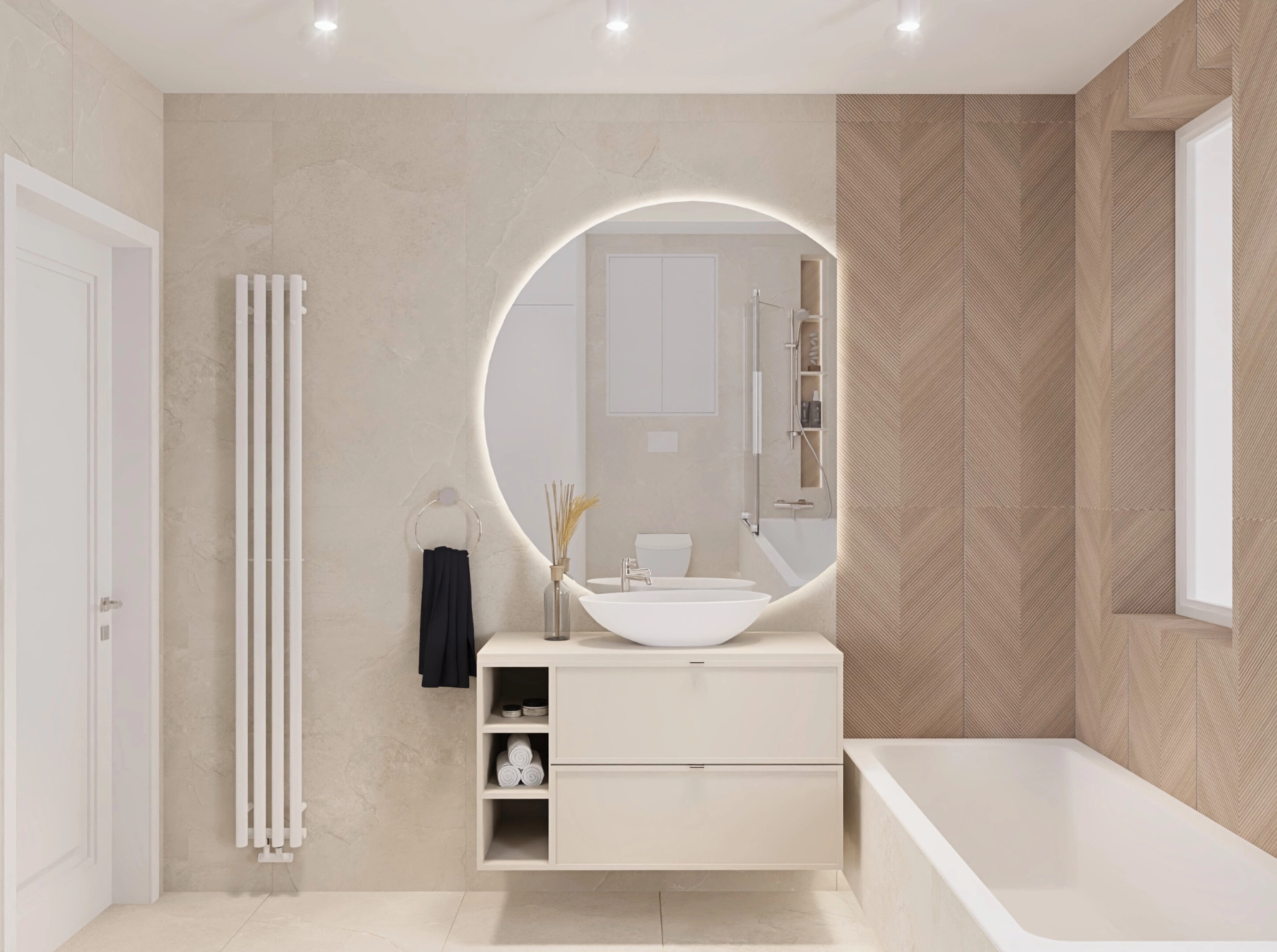Łazienka to połączenie funkcjonalności i subtelnej elegancji. Delikatny wzór jodełki, prosta forma i naturalna paleta tworzą spokojne, łatwe w utrzymaniu czystości wnętrze. Wygodna wanna z parawanem oraz klasyczna słuchawka prysznicowa (bez deszczownicy) odpowiadają dokładnie na potrzeby inwestorów.
