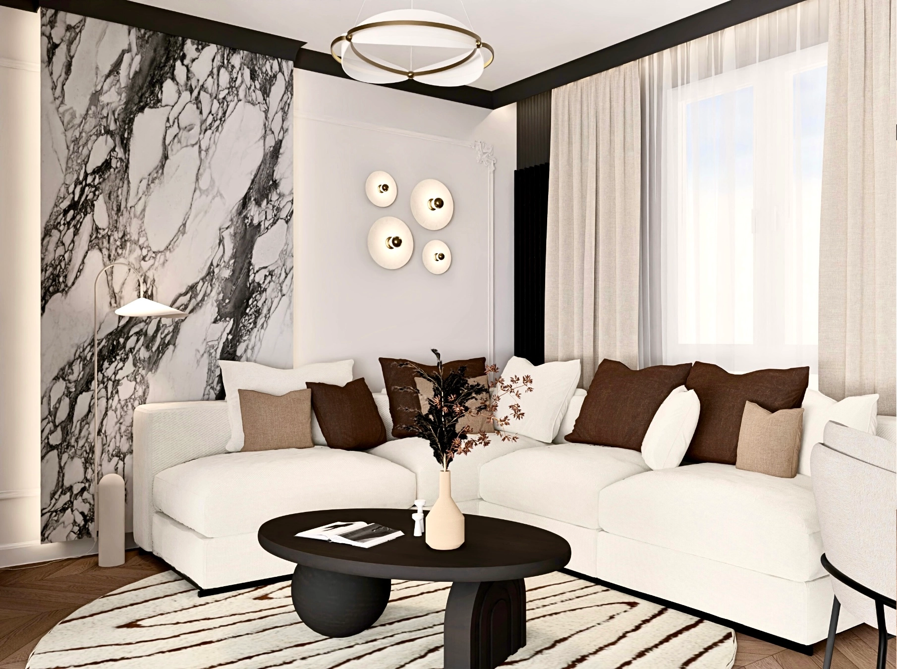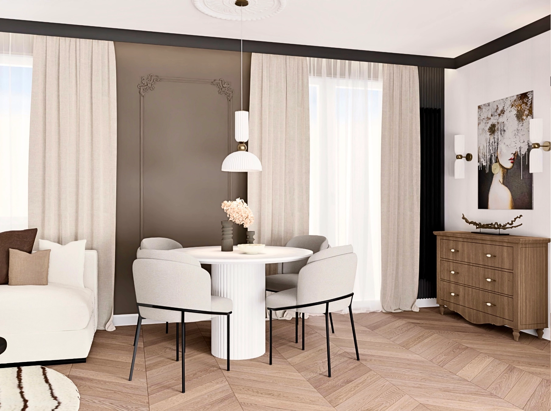 To wnętrze powstało z połączenia upodobań młodej pary, która właśnie zakupiła swoje pierwsze mieszkanie. Jasnej, eleganckiej klasyki, którą uwielbia Karolina oraz nowoczesnych, ciemniejszych akcentów bliższych Maćkowi.