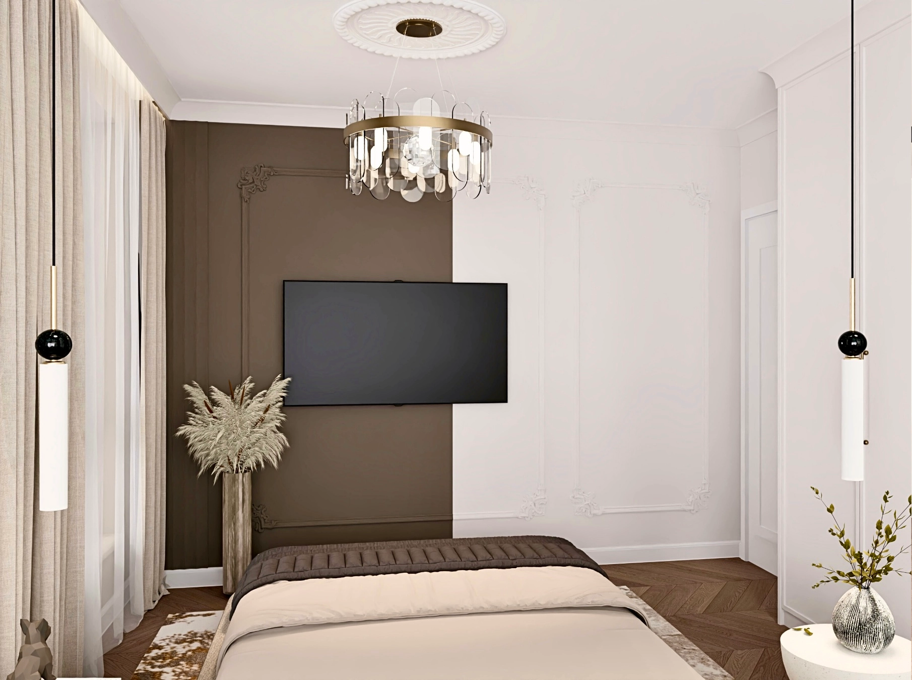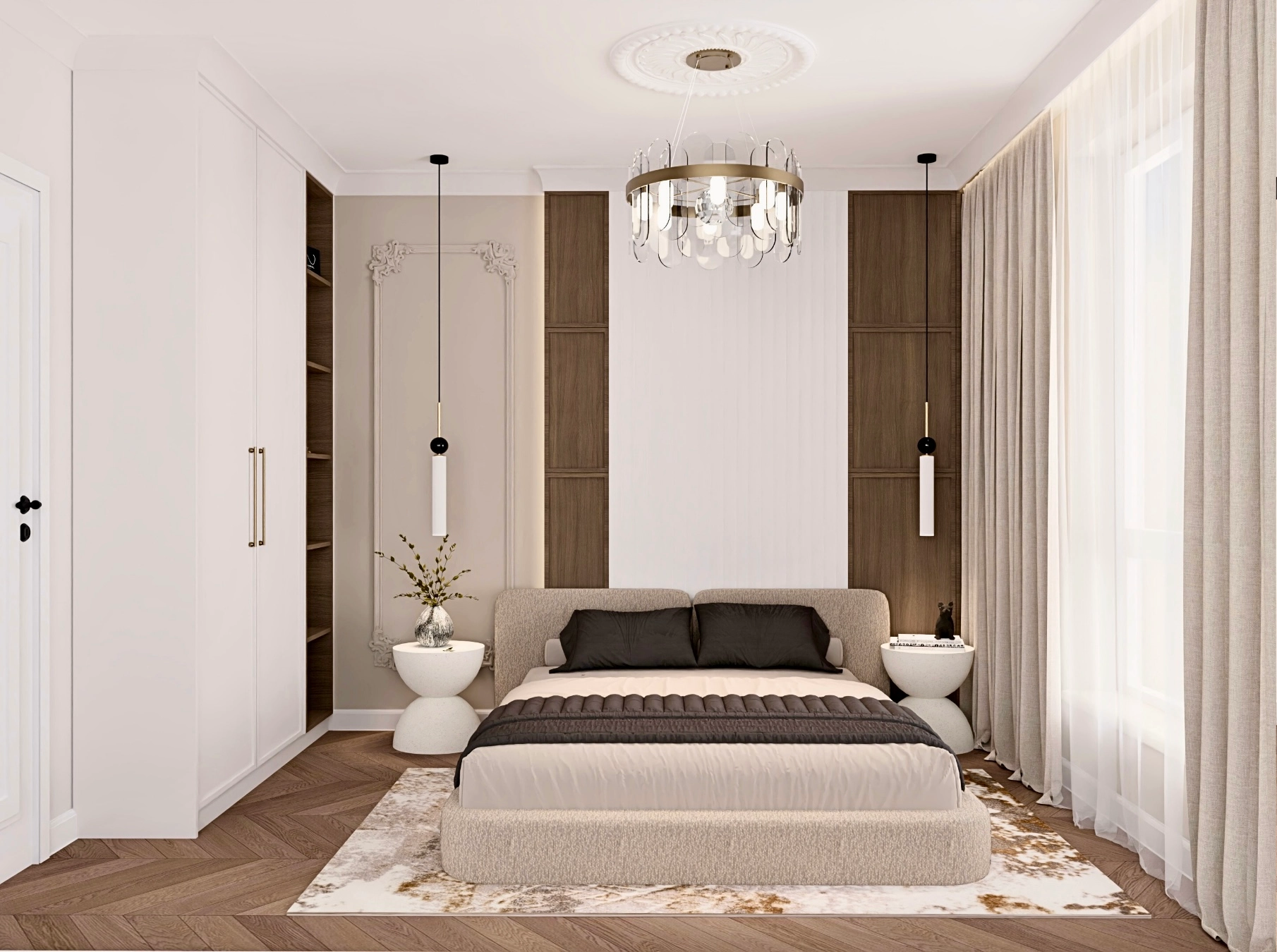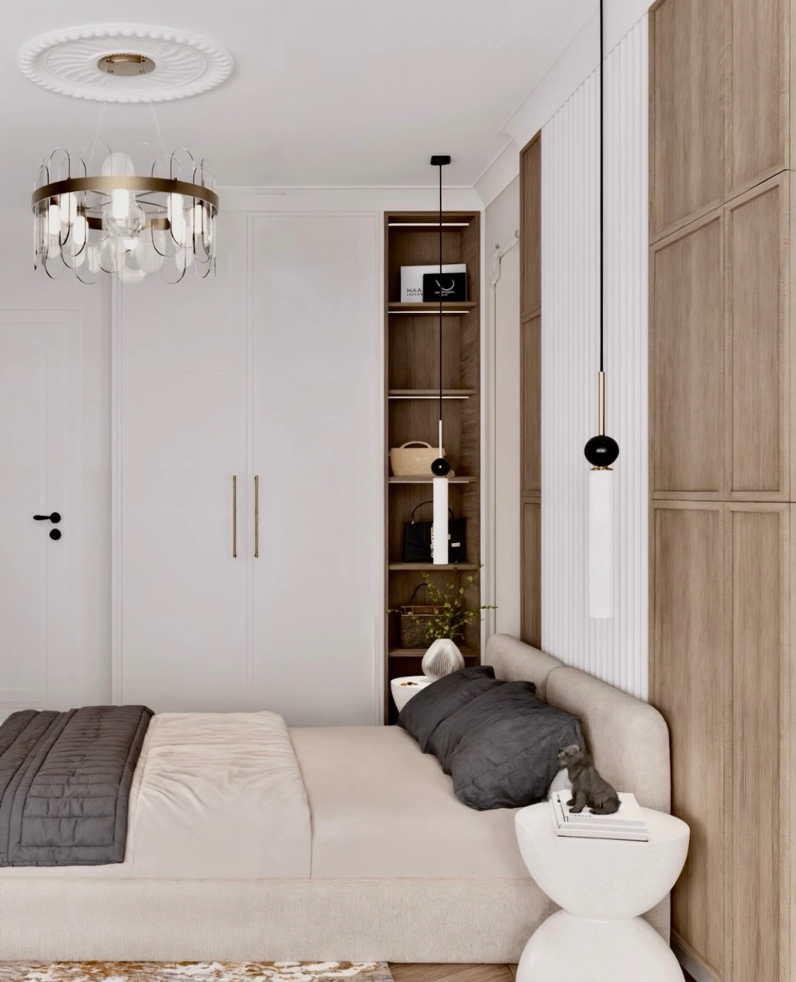 W sypialni główną rolę gra duże, wygodne łóżko z pojemnikiem na pościel ustawione na tle dekoracyjnej ścianki zbudowanej z paneli 3D i płyty z dekorem drewna. To pomieszczenie miało być spokojną, uporządkowaną przestrzenią, dlatego szafa jest tu jedynie subtelnym dodatkiem. Najpotrzebniejsze rzeczy są pod ręką, a pełne przechowywanie zostało przeniesione do osobnego pomieszczenia. Dzięki temu sypialnia pozostała przestronnym miejscem do odpoczynku.