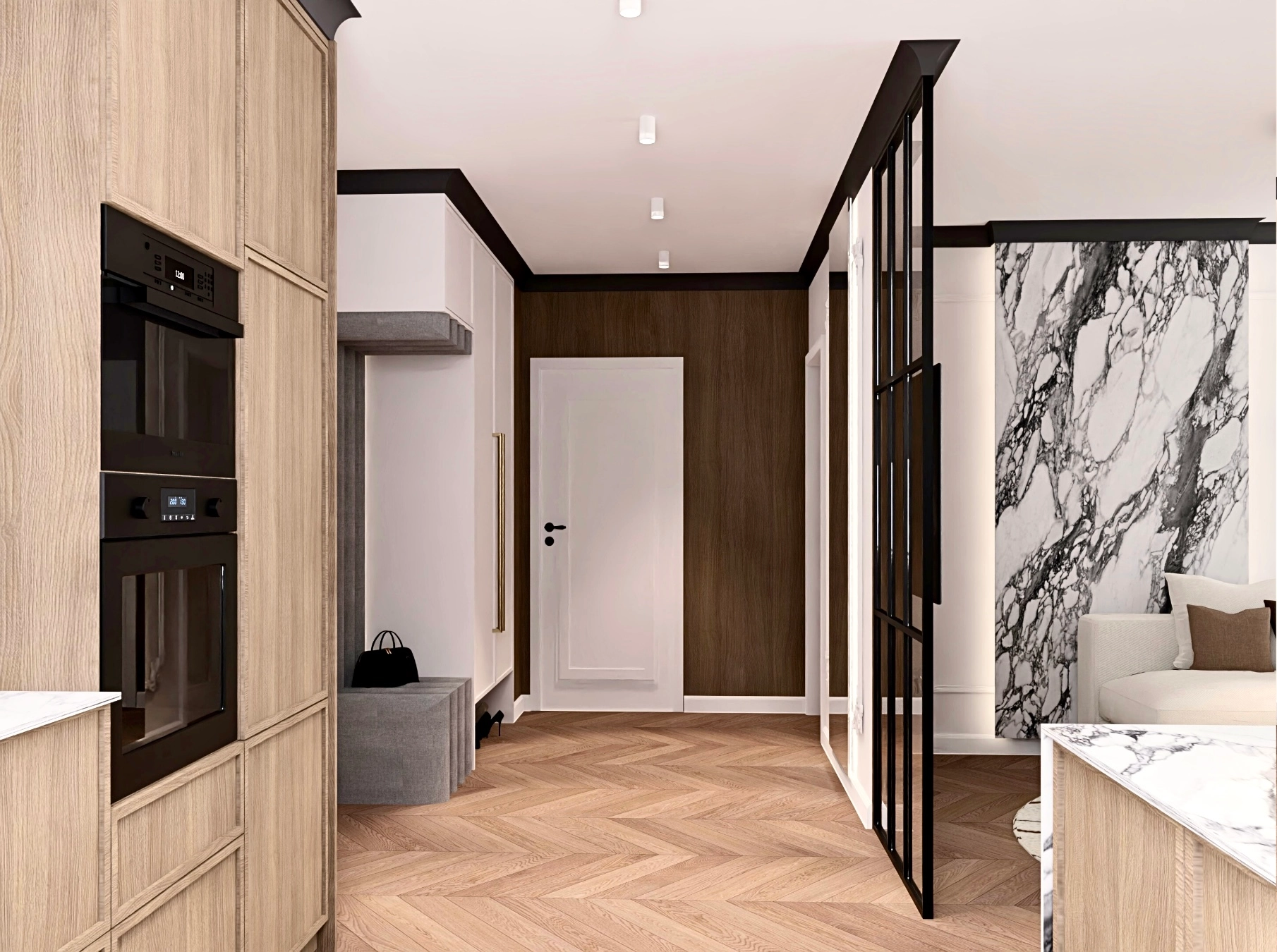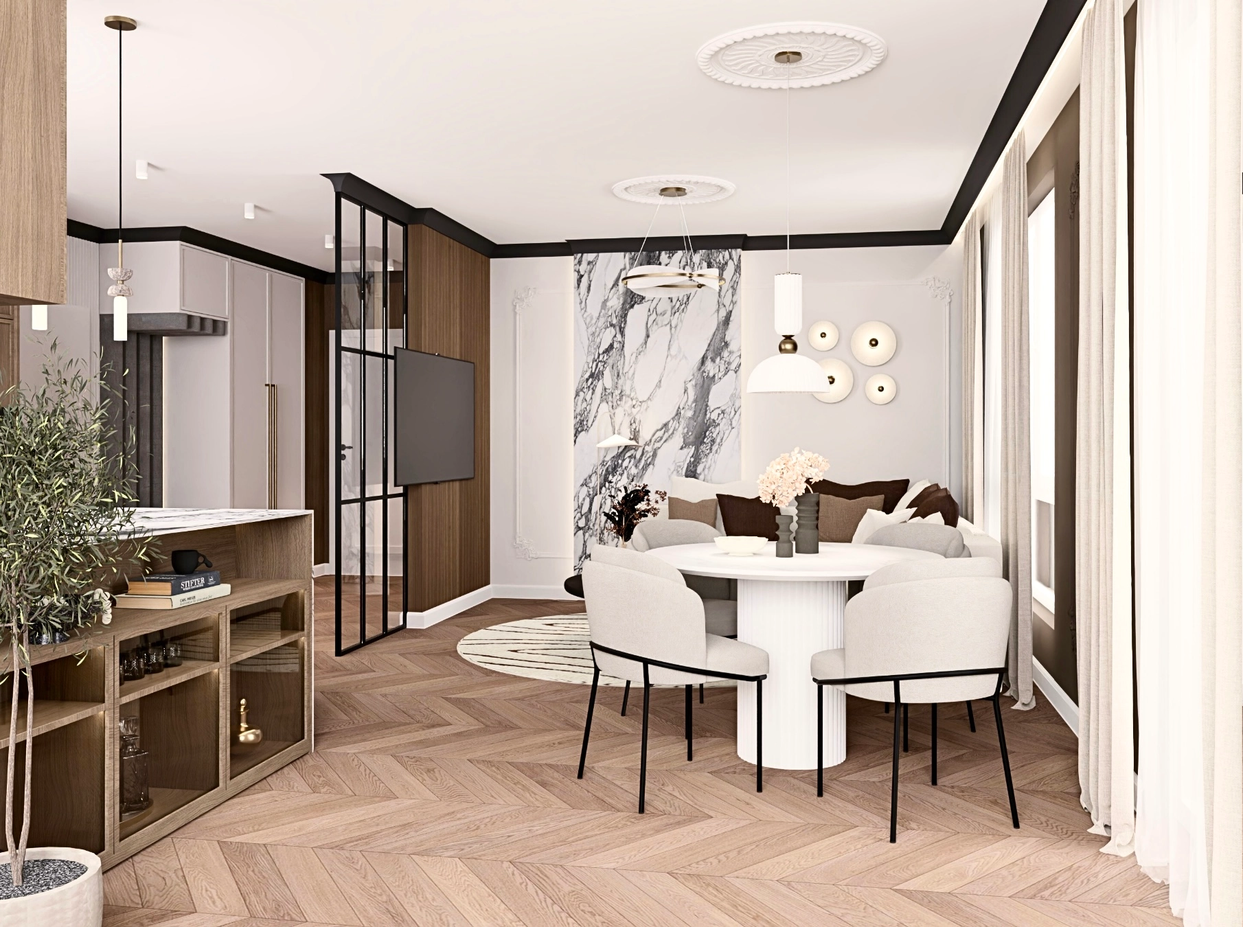 Mieszkanie zostało kupione po terminie zmian deweloperskich, więc musiałam znaleźć sposób, aby uniknąć efektu wejścia prosto na kanapę, która idealnie pasowała do narożnika pod oknem. Rozwiązaniem okazała się szklana ścianka z czarnymi profilami. Lekka, ażurowa i przepuszczająca światło ścianka oddziela strefy i jednocześnie pełni funkcję ścianki TV.
