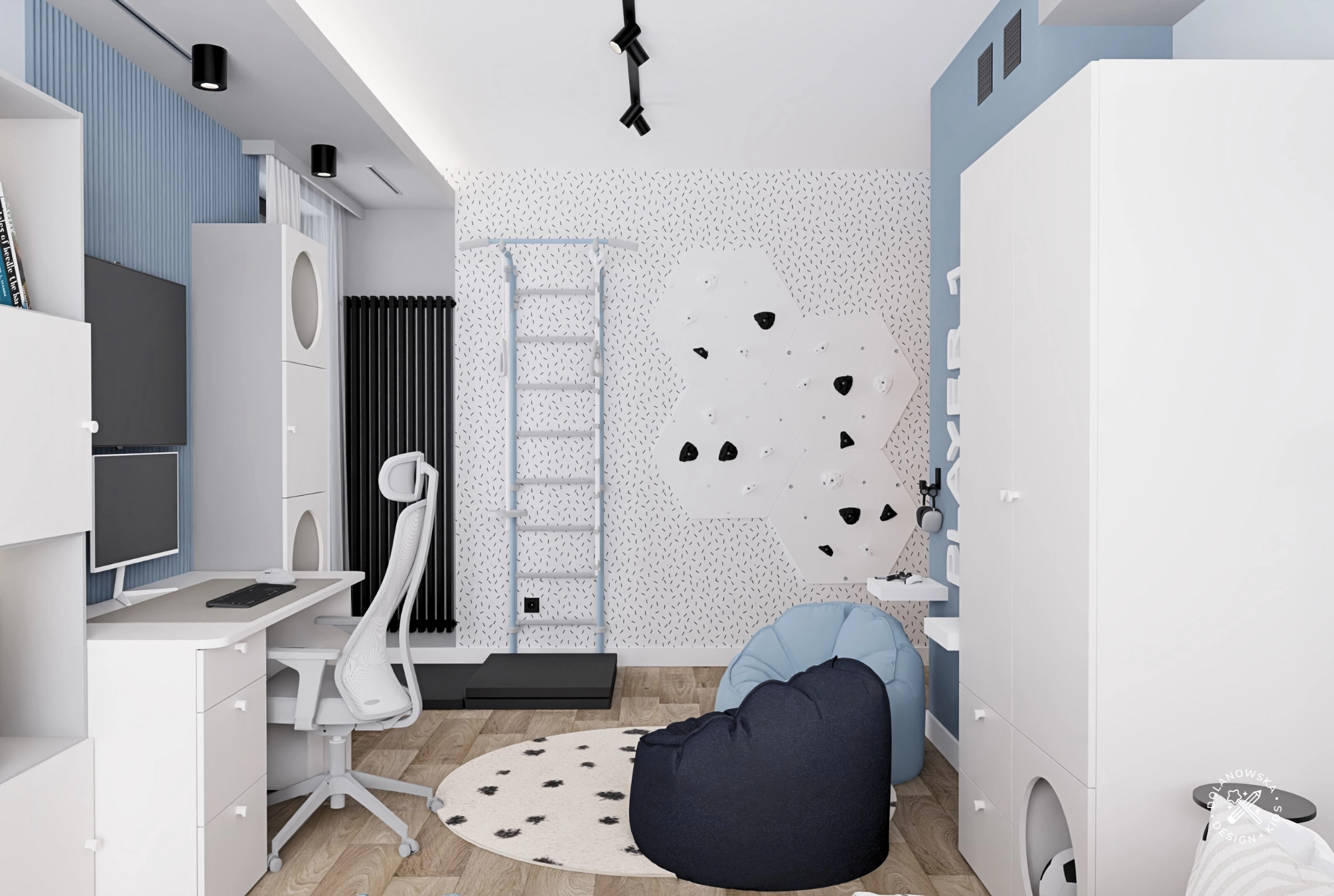 Pokój siedmioletniego Jacka to przestrzeń o powierzchni 17 m² zaprojektowana tak, aby została z nim także w okresie nastoletnim. Kluczowe wytyczne obejmowały stworzenie strefy do gry na konsoli, wprowadzenie drabinek i ścianki do wspinaczki, a także zachowanie stonowanej, ponadczasowej kolorystyki.