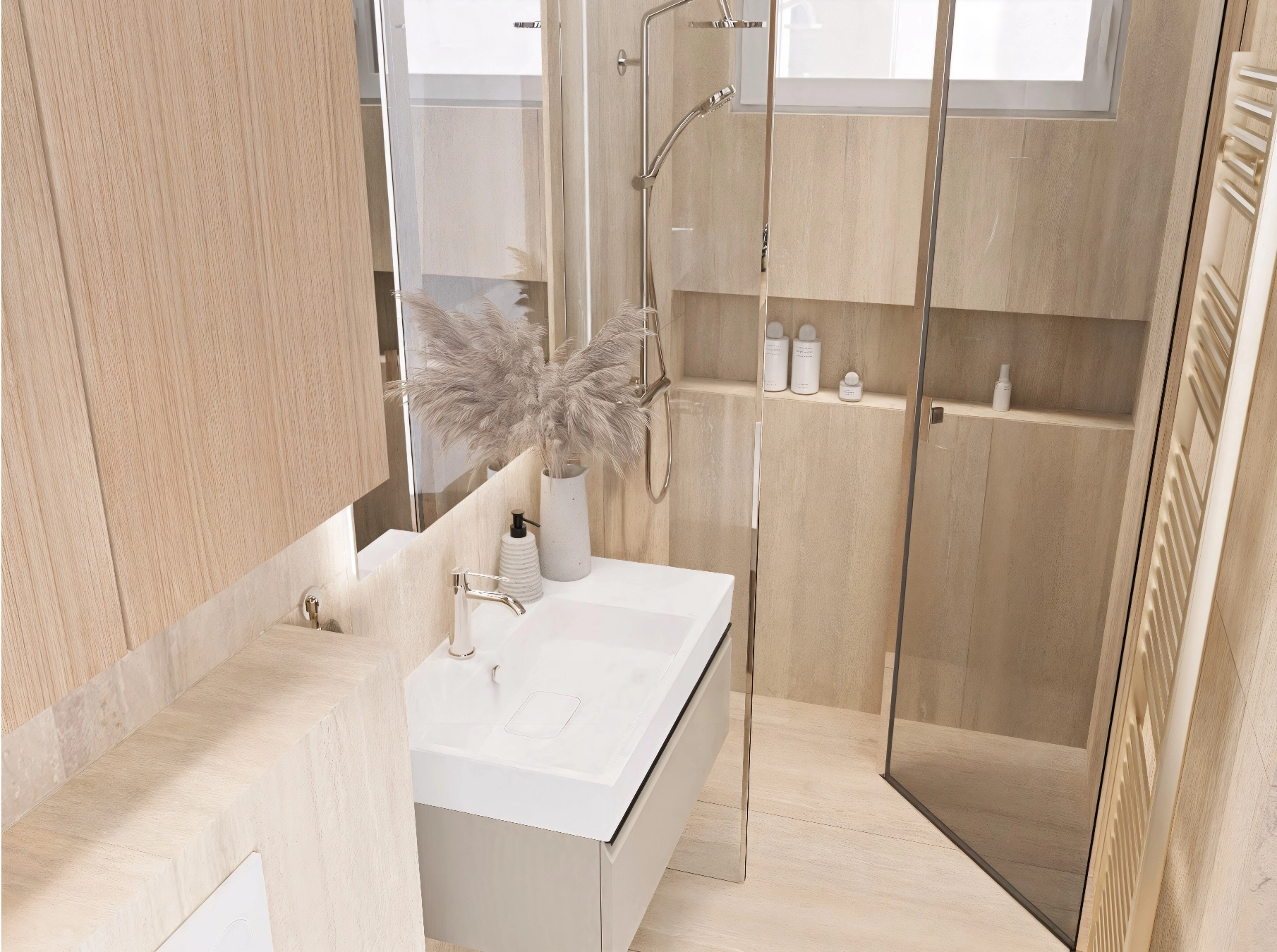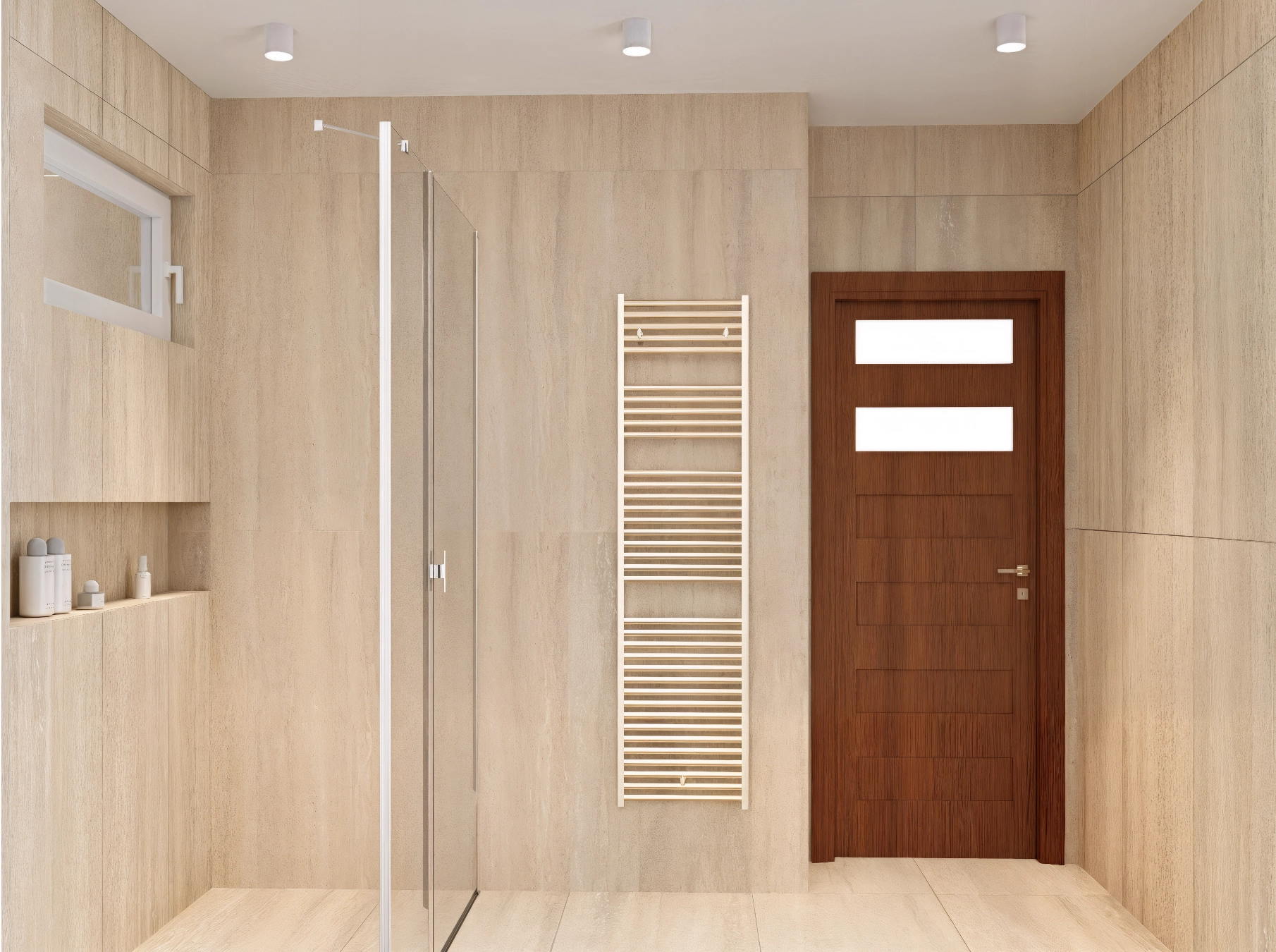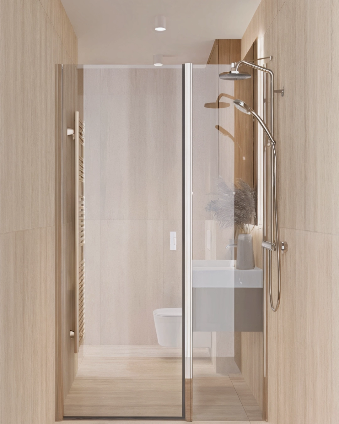 W projekcie postawiliśmy na ciepłe płytki hiszpańskiej marki Porcelanosa, pięknie imitujące trawertyn, które całkowicie zmienią charakter wnętrza. Już podczas pierwszej wspólnej wizyty w showroomie inwestorka wiedziała, że ten styl, ten design to jest to. To jeszcze nie koniec wprowadzonych zmian – aby zwiększyć przestrzeń, zostanie wyburzona ściana, a łazienka powiększy się o około 1,5 m, co pozwoli wygospodarować miejsce na duży wymarzony prysznic.
