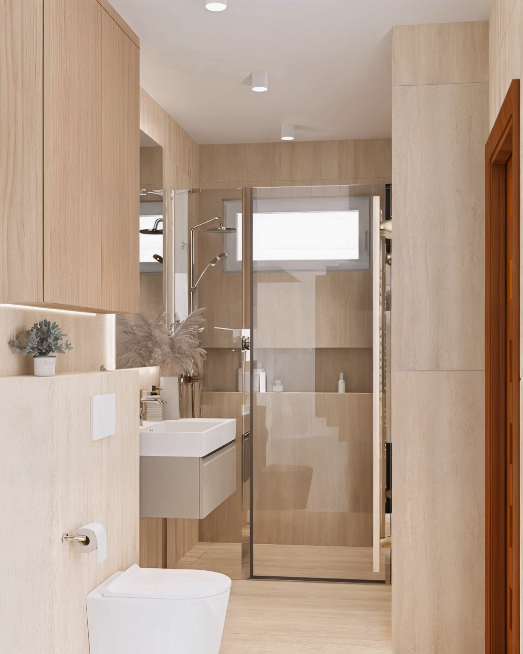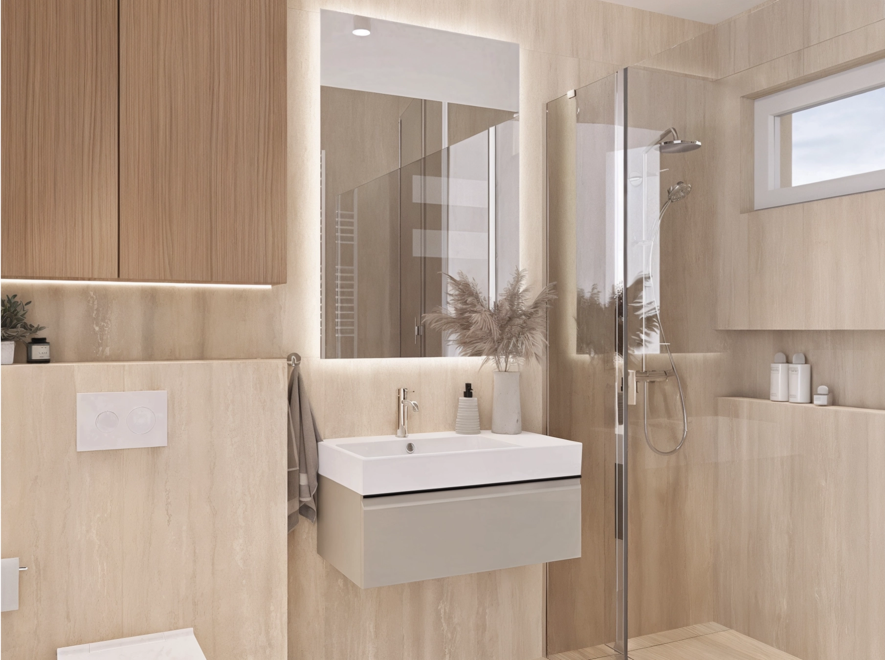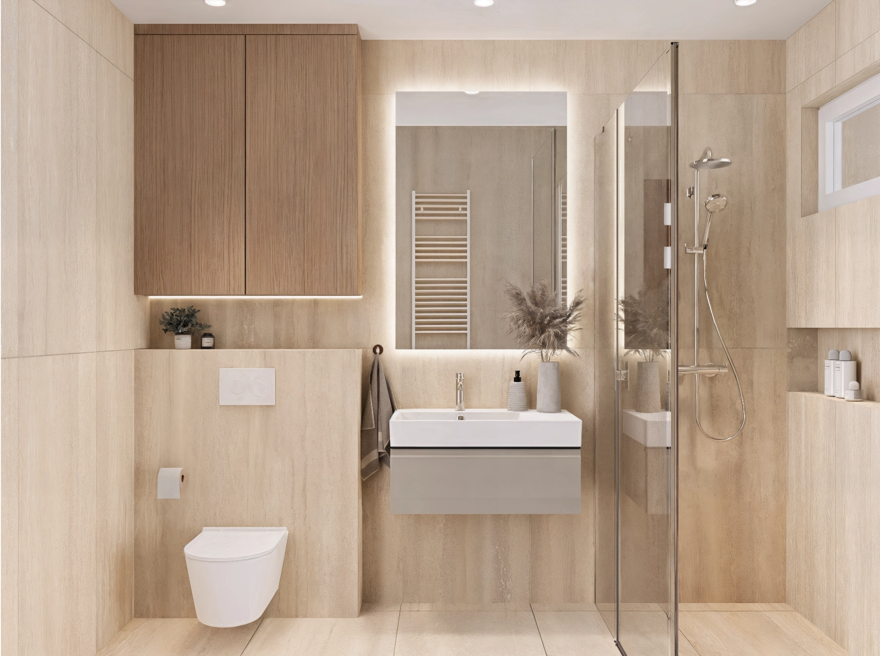 Dodatki takie jak lustro LED oraz podświetlenie szafki wiszącej, podkreślają naturalne ciepło materiałów i nadają wnętrzu przytulnego klimatu jak w hotelowym spa.
